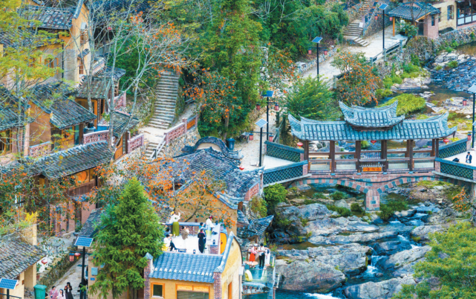初冬时节,屏南县熙岭乡的柿子林依旧暖意融融。红彤彤的果实挂满枝头,与墘头村沿溪而建的青瓦民居、清澈流淌的溪水、郁郁葱葱的竹林相映成趣,往来游客穿梭其间,或驻足拍照、或漫步闲谈,一幅“人在画中游”的美丽乡村图景生动铺展。
