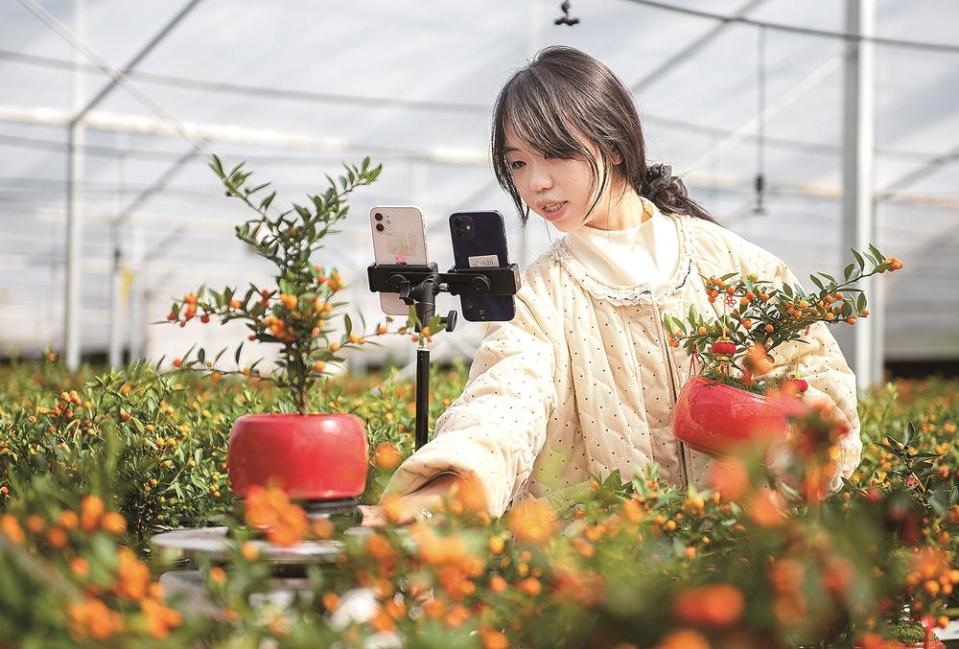 2月4日,位于永春县的福建海峡花卉产业园内,销售人员通过网络直播推介并销售永春“金豆”盆栽。永春“金豆”盆栽凭借古朴雅致的观赏质感和富贵吉祥的寓意,成为年宵花市场的热销产品。据了解,该产业园的永春“金豆”盆栽主要销往福建、广东、上海、北京、山东等地,日均销售2000多盆。(通讯员 康庆平 摄)