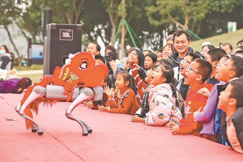 2月23日,在福清市石竹山风景名胜区,游客与智能机器狗互动。当日,景区举办机器人热舞、汉服巡演、欢乐成语接龙等活动,以“科技+非遗+百业”等形态,吸引市民游客前来观赏。谢贵明 摄
