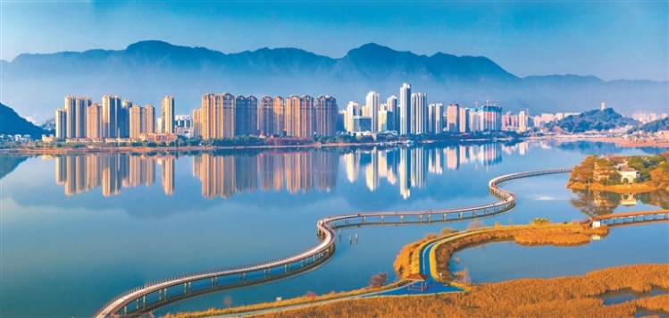 湖光城影两相宜,栈道蜿蜒入画来。记者 王志凌 摄