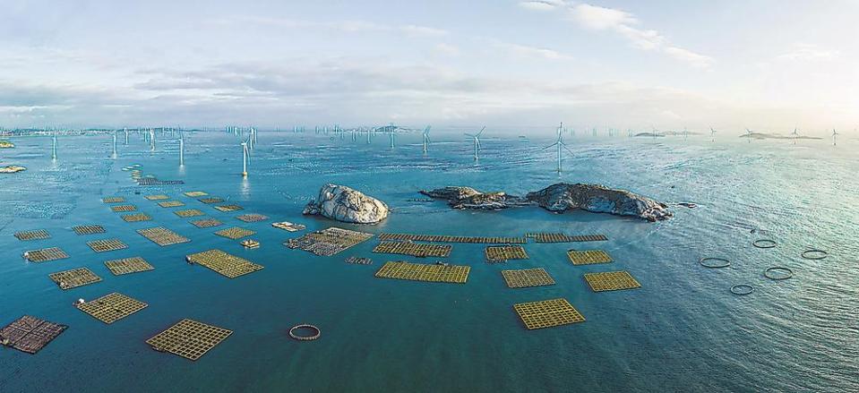 3月底,养殖区如棋盘般铺展于海面上:浅海浮筏式网箱整齐划一,浮球点点随波起伏。风力发电机、沙滩、岛礁、港湾、渔排、渔船,共同勾勒出一幅壮阔的海洋牧场画卷。